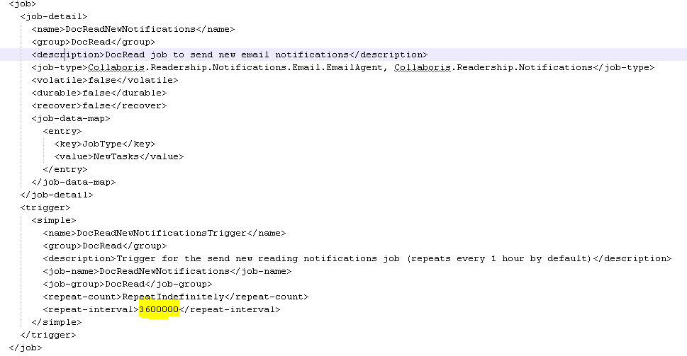 You can configure the frequency of the above jobs (and change these default values) by updating the “jobs.config” file under the “[Program Files]CollaborisDocReadScheduler”. Each job contain a “repeat-interval” element that is specified in milliseconds. Just remember that, after changing the file, you will need to restart the scheduler service ( which can be done via the “DocRead Scheduler” tool )