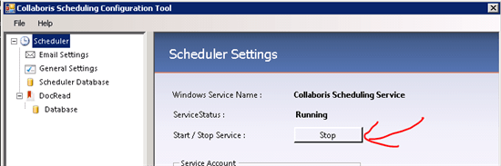 - The Collaboris Notification Service isn't started. To start load the 'Collaboris Scheduling Configuration Tool' and click 'Start' (see image below).