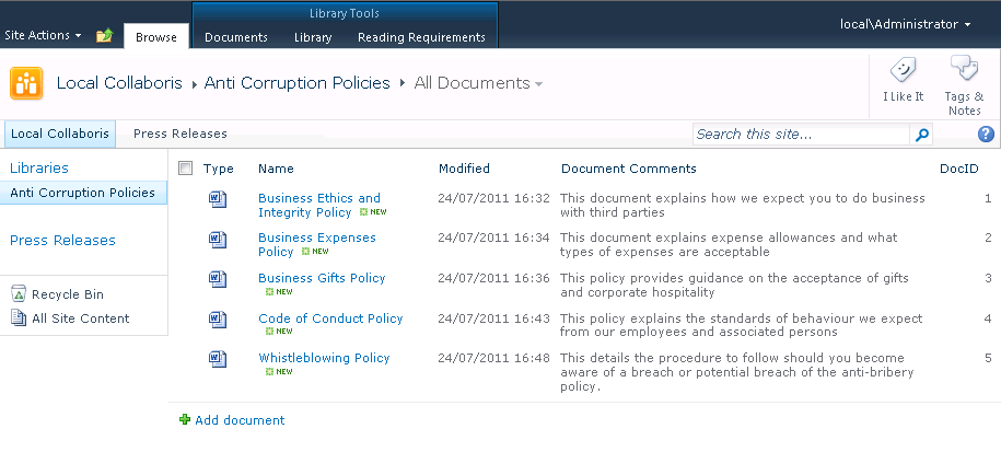 Once you have defined what your anti-bribery plan is and created your bribery act policies and guidance, the last step is the most important! Now you are ready to distribute your policies so that associated persons actually read and acknowledge them. This last step is easier than you think using DocRead for SharePoint.
