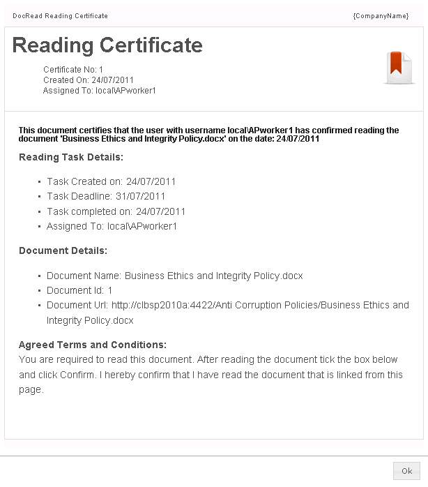 As detailed in the previous section, after completing their reading task each user is sent a reading certificate which is also stored within DocRead. This gives you proof that you issued the documents and that your employee confirmed that they have read and understood them. This can be really important to prove that your procedures were 'adequate'.