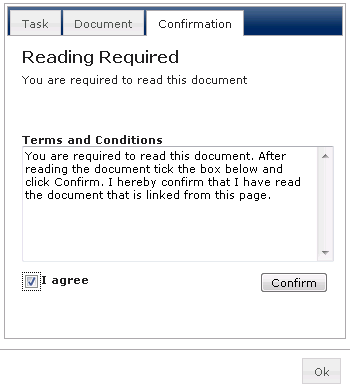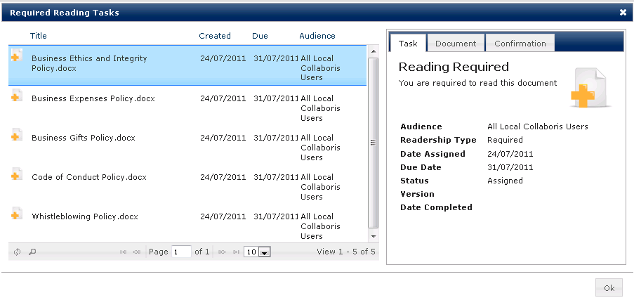 Users need to follow a simple process to complete a reading task. DocRead webparts are provided so you can add reading task details in very conspicuous parts of your intranet. The webparts could be added to a home page or mysite page for example, so your users see them as soon as they log onto the intranet - it's completely up to you. If you don't wish to use webparts, users can view their reading tasks by navigating to the relevant DocRead enabled library containing the policies.