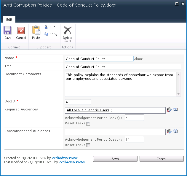More often than not, you will want all employees to read your anti-bribery policies; in this case, you would simply select a SharePoint audience (or group), that represents all of your employees. However, as your organisation changes, you may, for example, partner with a third party contracting company who would also need to comply with your organisational anti-corruption policies. In this instance, you would either use an existing audience, or create a new one that includes the third party users*.