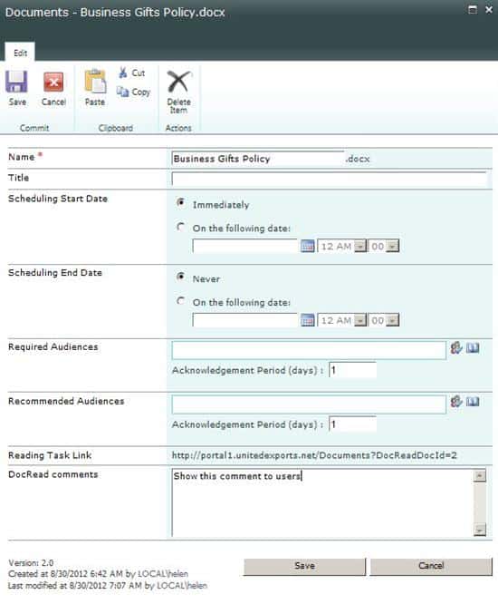 DocRead can be used to create specific tasks for users requesting that they read and acknowledge key documents. The tasks can relate to policies, procedures or other important information. DocRead is particularly useful where compliance with these documents is essential for legal or other business requirements.