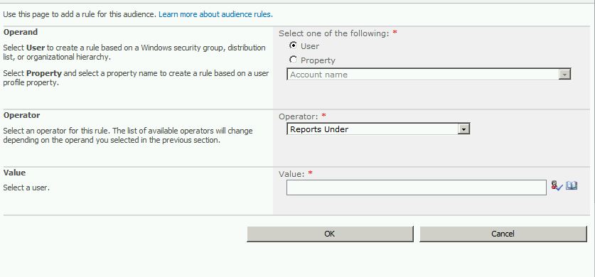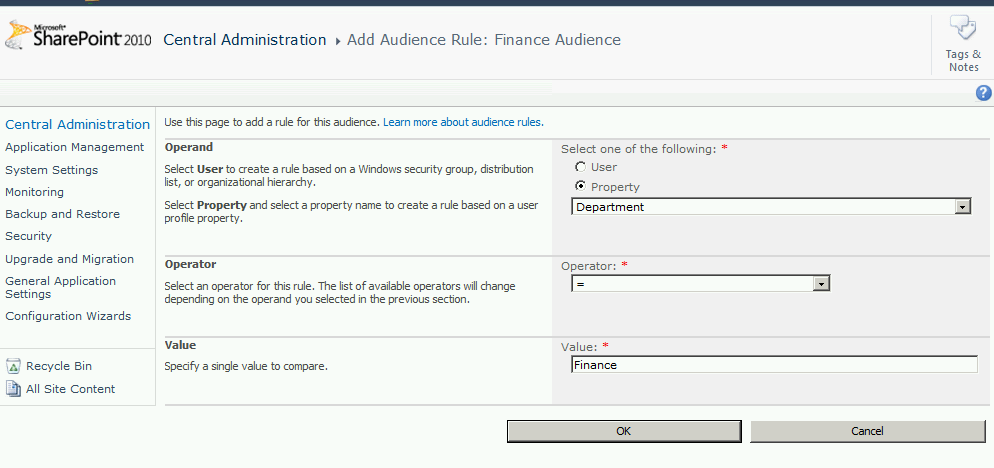 For my example I intend to target Finance department users so I will choose “property” and in the drop down I will select “Department” property. In the operator section select “=” operator and in value mention the name of the target department, which in my case is “Finance” and click OK.