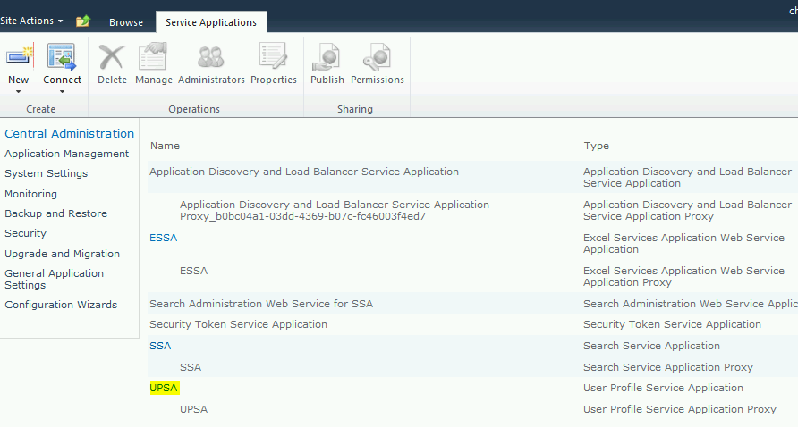 Application Management—–> Manage Service Applications—–>UPSA (UPSA is the name of my user profile service application)