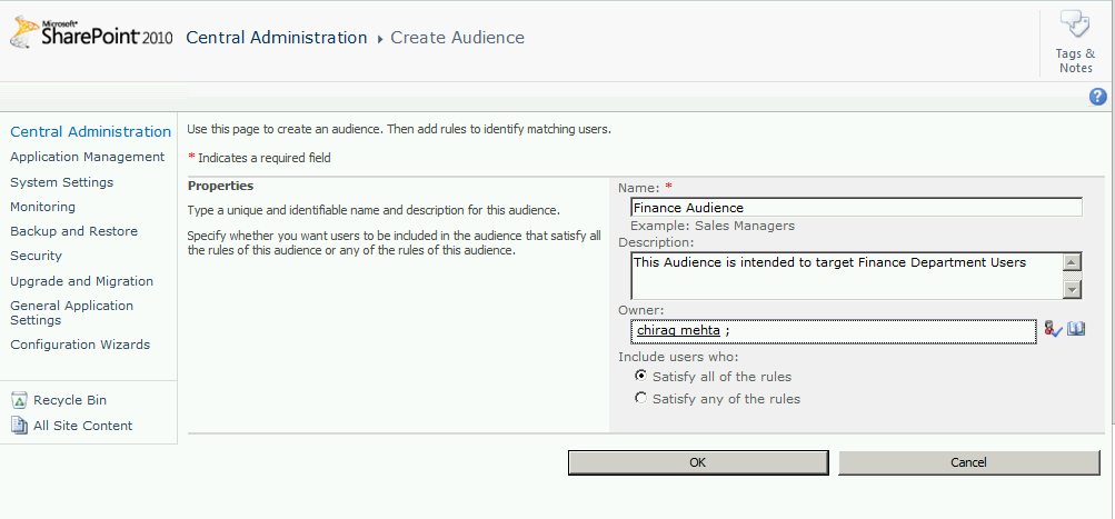 Give it a name, description and an owner as per your requirement. For my example I intend to target users in Finance department so, I will give it the name “Finance Audience” and I will make myself as the owner. In the radio button I will check satisfy all of the rules and click OK. You can choose either of the two options based on the logic on which you want to compile your Audience.