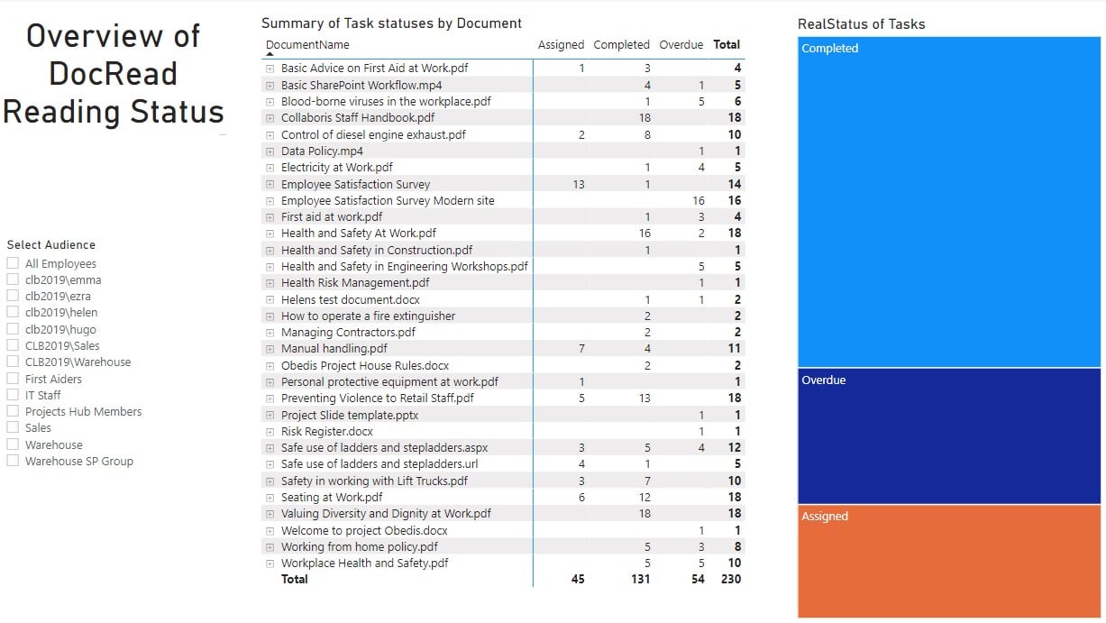 Here's how to create a summary of all DocRead tasks showing the reading status (assigned, completed, overdue) in Power BI. The end result will look like this: