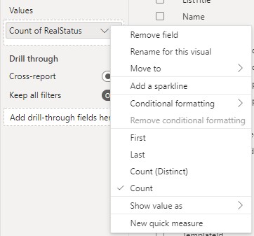 Drag the "RealStatus" field into the Group and also use it as the Value. Amend the value to show the 'Count of' as before. Your selection should appear as below.