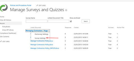 To delete a survey you first need ensure that it is not attached to any document or else the users will receive an error if they try to complete it via the document (i.e. when they select “Complete Survey” on the document library Ribbon or when they try to complete a DocRead task assigned to a document that hasĀ the Survey attached).