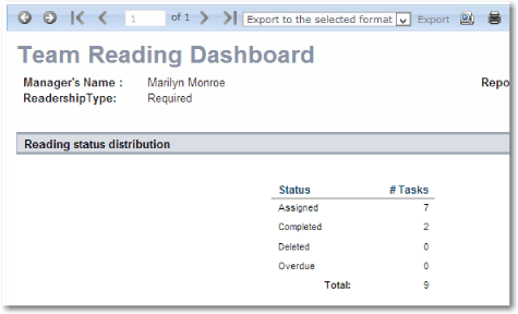 - Both the "Team Reading" and "Team Members" Dashboards show at high-level the status of a particular line mangers staff. Both Dashboards can easily drill down into more detailed reports for further analysis.