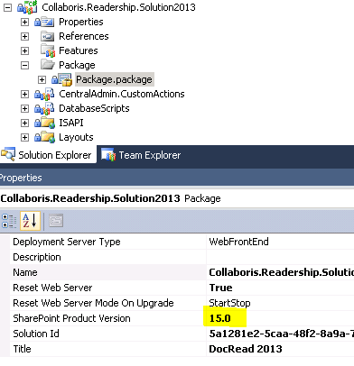 The first thing you need to do is change your ‘SharePoint Product Version’ to “15.0“. Doing this causes your solution to be treated as a SharePoint 2013 solution and will deploy all of the components to the correct locations.