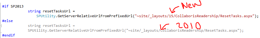 This will probably catch you out. If you continue to callSPUtility.GetGenericSetupPath(), this will return a link to the 14 hive (SharePoint 2010), not the the new 15 hive (SharePoint 2013). So if you are programmatically getting handles to files using this approach, they will not longer be found. Instead of this you – use SPUtility.GetVersionedGenericSetupPath(). We support all 3 versions of SharePoint using conditional compilation statements like this :