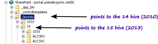 If you have any code that accesses the ‘_layouts’ folder using the virtual directory that gets added to every SharePoint IIS application, then you need to use the correct version. Look at the picture below, you will notice that’s there actually virtual directory inside of layouts called ’15’.