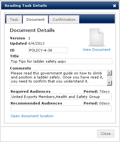 The screen below is an example of what the end user sees when they click on the new reading tasks. They can view information about the document (which is really a link), and also click ‘View Document’ to view it. So in this case, when they click ‘View Document’ a new browser window will be shown with the Ladder page on it.