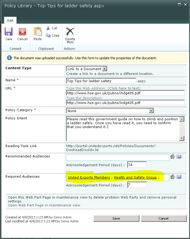 4) When you view the ‘Edit Properties’ screen for the link to your document, you will now see the Reading Task Link, and Recommended and Required Audiences elements. If not, review the last 3 steps to make them visible.