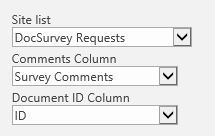 - Select “DocSurvey Requests” from the Site list drop down options, choose “Survey Comments” for the comments column and “ID” for the Document ID column