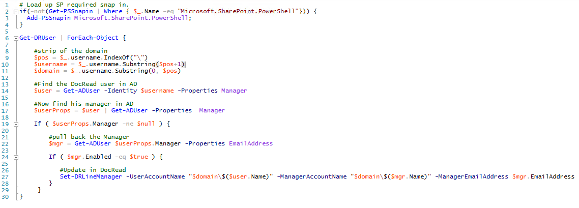 In DocRead 2.1 (available mid-September) we introduced some new Powershell Cmdlets to help SharePoint Administrators synchronize the ‘Manager’ property from Active Directory to the DocRead database.