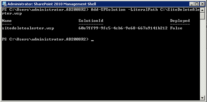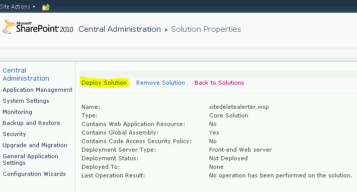 Now load Central Admin and navigate to Farm Solutions screen. Once you have found ‘Sitedeletealerter.wsp’ – click on it and the click ‘Deploy Solution’… Wait a while…