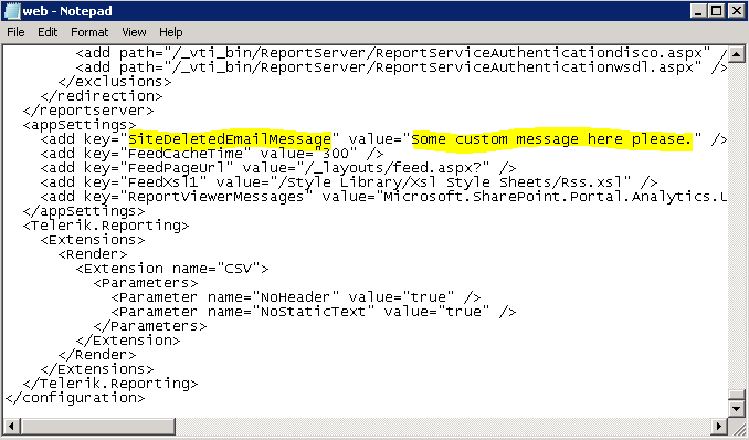 If you want to customise the standard email message that gets sent out – add an ‘AppSetting’ key / value pair called (‘SiteDeletedEmailMessage‘) inside the web.config of the web application containing your site collection(s). This is optional though.