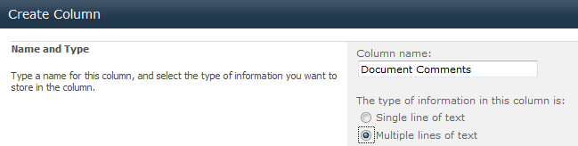6. In the Column Name box write ‘Document Comments’ and select ‘Multiple lines of text’ then click ‘OK’.