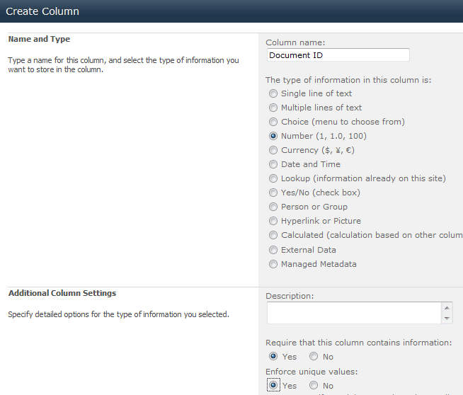 8. In the boxes at the bottom of the screen select ‘Yes’ for ‘Require that this column contains information’ and ‘Enforce unique values’.