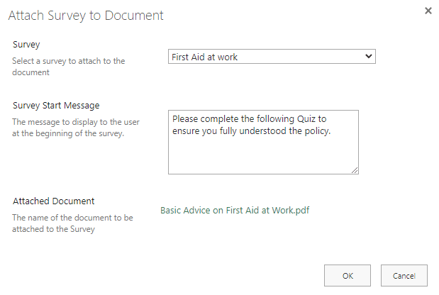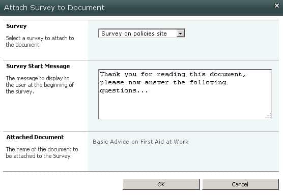 3) Use the 'down arrow' to select the survey that you want to attach to the document and add a message that you want the user to see before they take the survey.