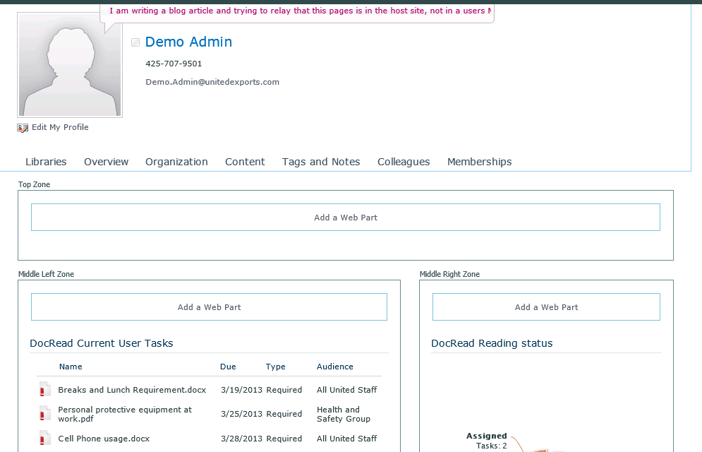 The following steps illustrate exactly how to add the DocRead Web Part to the MySite host, but as mentioned, this can really be *any* SharePoint Web Part. So when we show / talk about DocRead just swap it around in your mind.