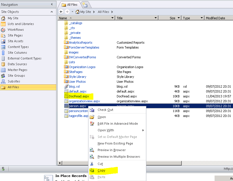 2. Once SharePoint Designer is loaded find a page you want to copy (we chose ‘person.aspx’).