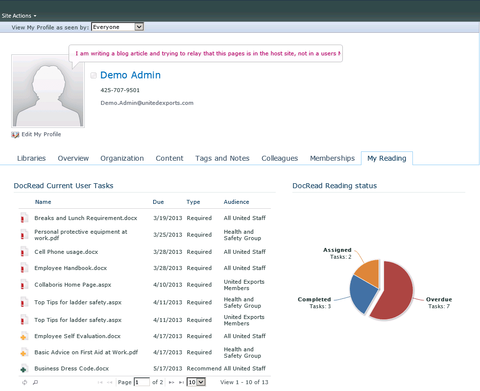 This post will outline how to add a web part to every users MySite. The web part we are going to add is the standard DocRead Reading Tasks web part, but this process can be applied to any web part in SharePoint.