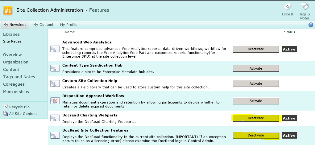 In the example above, we have activated two DocRead features which import our charting and reading task web parts. Clicking them again would deactivate them.