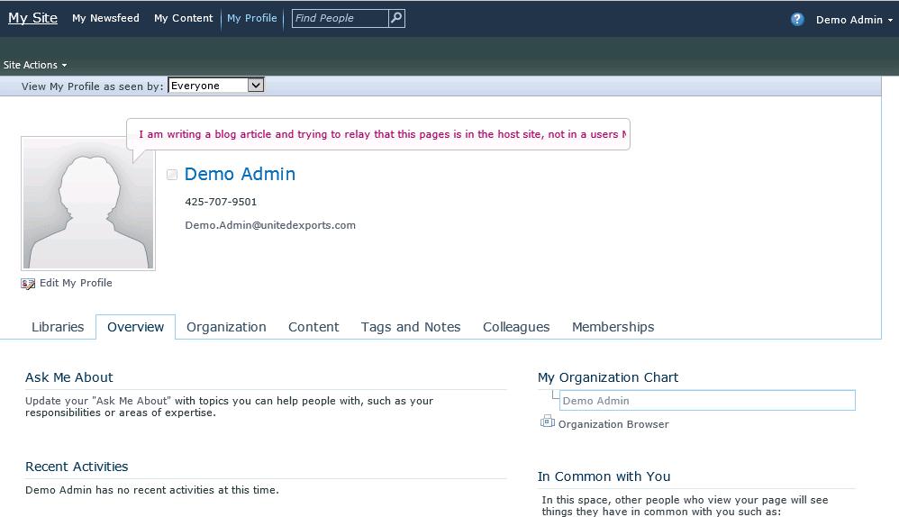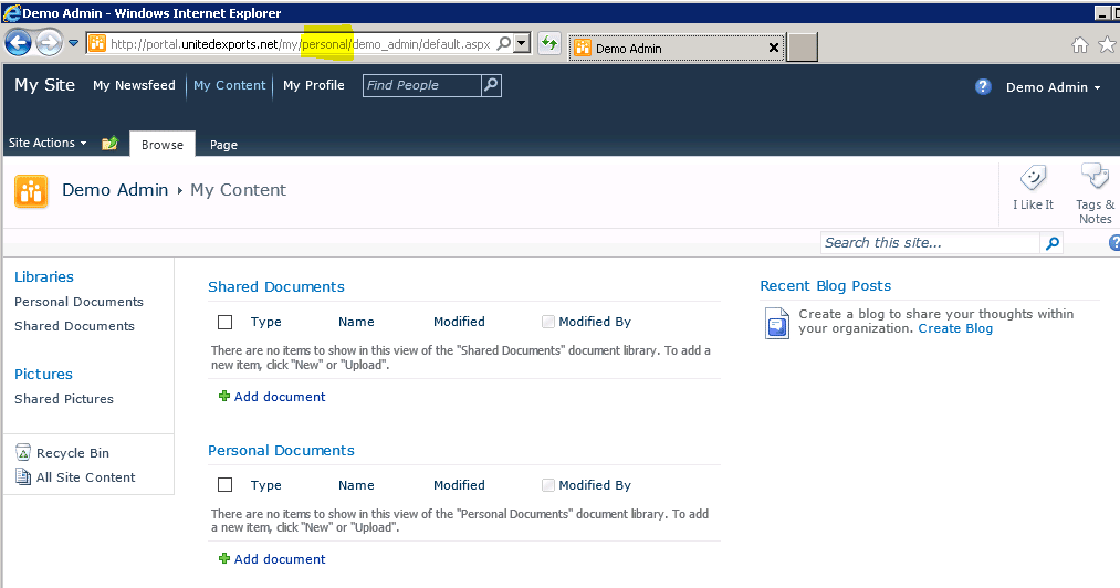 This site collection is used to store a users personal documents. It’s a completely, separate site from the MySite Host. It’s also very common to only provision this site when a user clicks on the ‘My Content’ menu. Once the site is created, the user will be the sole site collection administrator. If they choose to add a document to the ‘shared documents’ library, this will be effectively viewable by anyone with access to SharePoint.