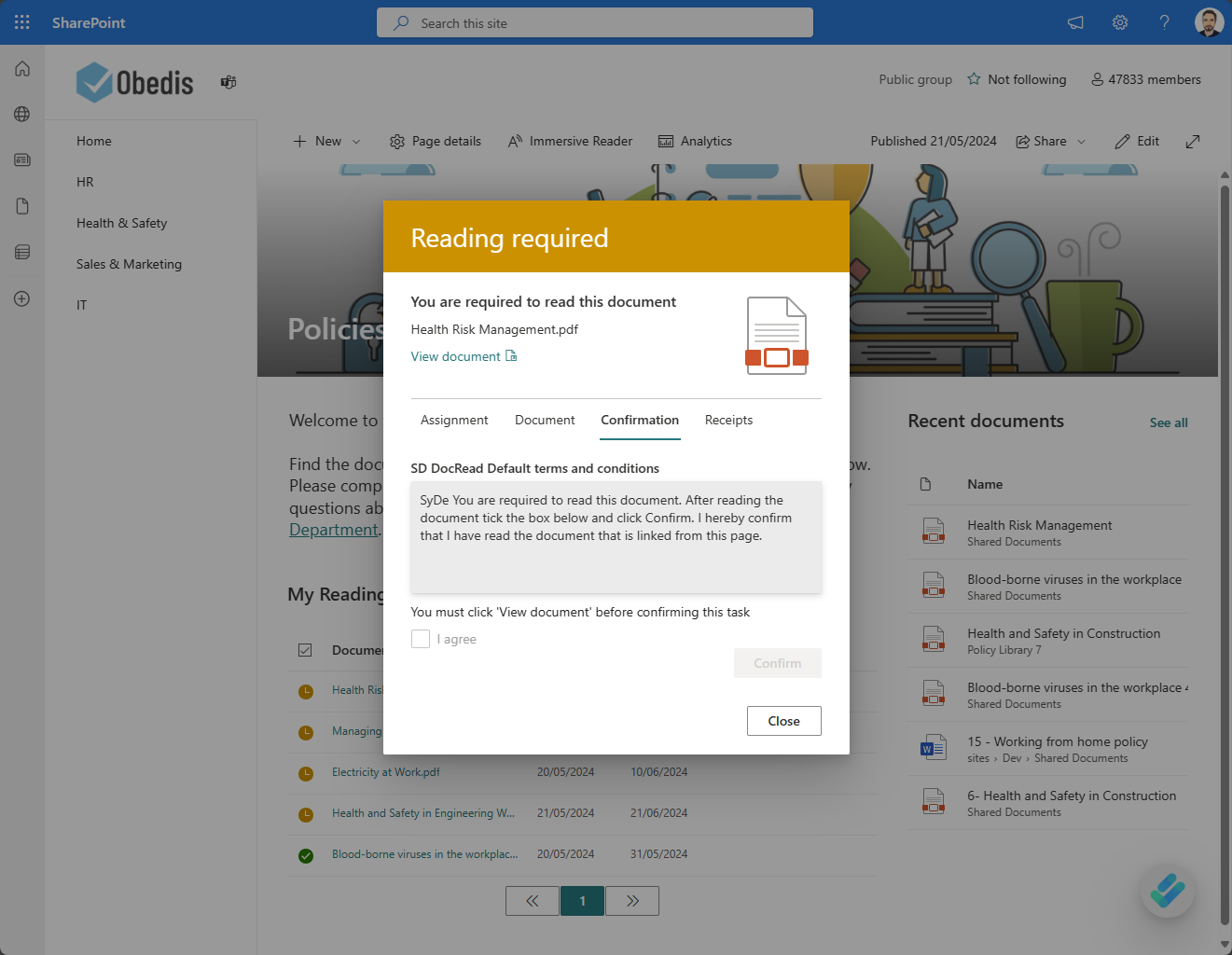 Target any content stored in SharePoint or on the web to new employees. DocRead will automatically create assignments, requiring users to read and confirm they have reviewed the content as soon as they join the company.