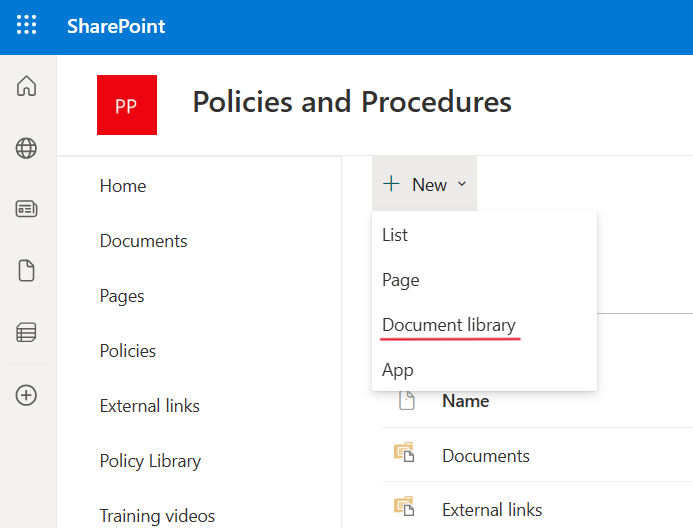 2) From the site contents page, select "+ New" then "Document library".