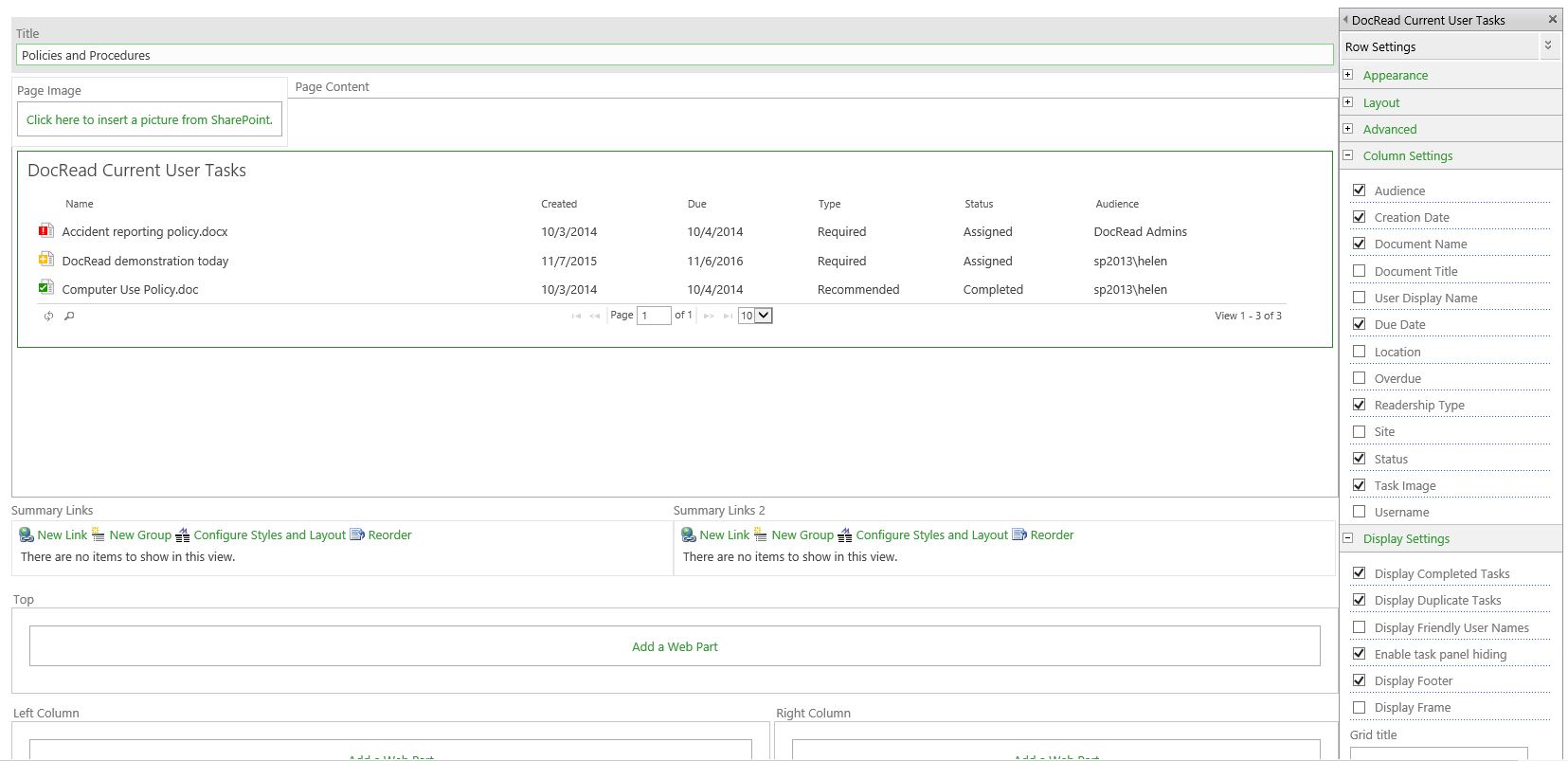 DocRead web parts can be placed on any page within a site collection where the DocRead site collection feature is activated. Each web part is fully customizable to allow your organization to select the columns that are displayed to the user. In addition, tasks can be filtered to hide completed, duplicated, recommended or required tasks.